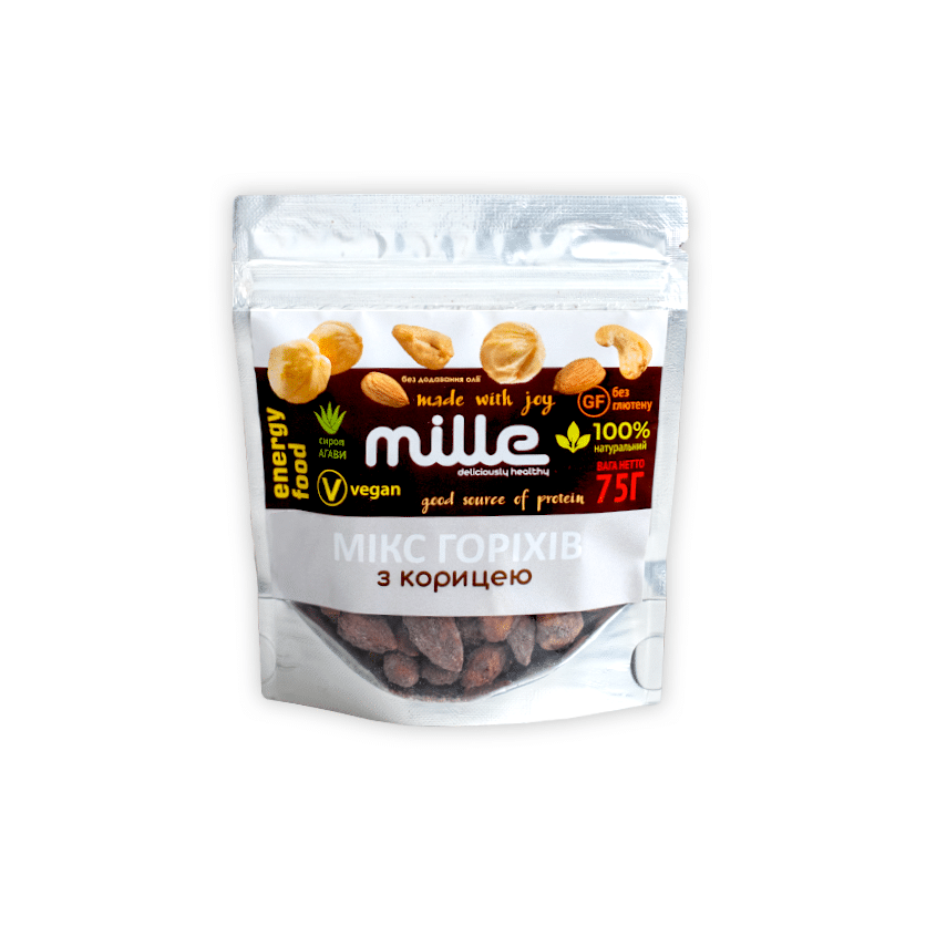 СКЛАД: Фундук, мигдаль, кеш’ю, органічний тростинний цукор, органічний сироп з агави, кориця, рожева гімалайська сіль.